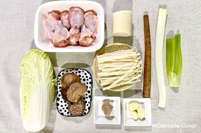 ・鶏手羽元 ・白菜やキャベツ ・ネギ ・大根 ・ごぼう ・えのき ・干し椎茸